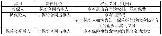 确定投保群体利益的概念,首先需要确定投保群体的概念。保险合同当事人包括投保人和保险人,与投保相关的群体包含投保人、被保险人和保险金受益人。在实务中,很多财产保险合同的合同条款中基本不使用投保人而直接使用被保险人的概念。人身保险合同根据投保人、被保险人和保险金受益人的不同,大体上可以分为“为自己的保险”和“为他人的保险”;根据被保险人的情况不同,还可以分为“为自己的生命和身体的保险合同”和“为他人的生命和身体的保险合同”。在保险合同中,投保人、被保险人和保险金受益人的法律地位并不相同,主要表现如下图所示。