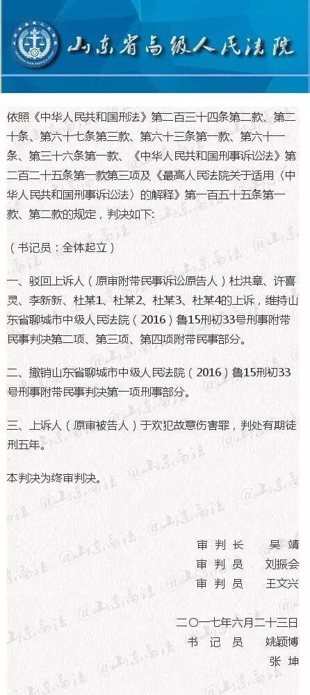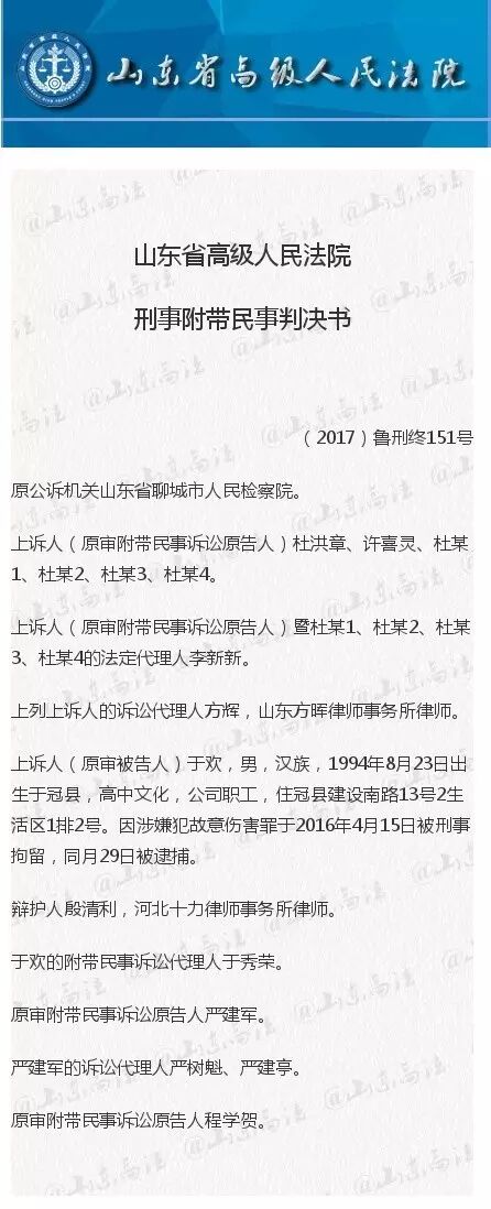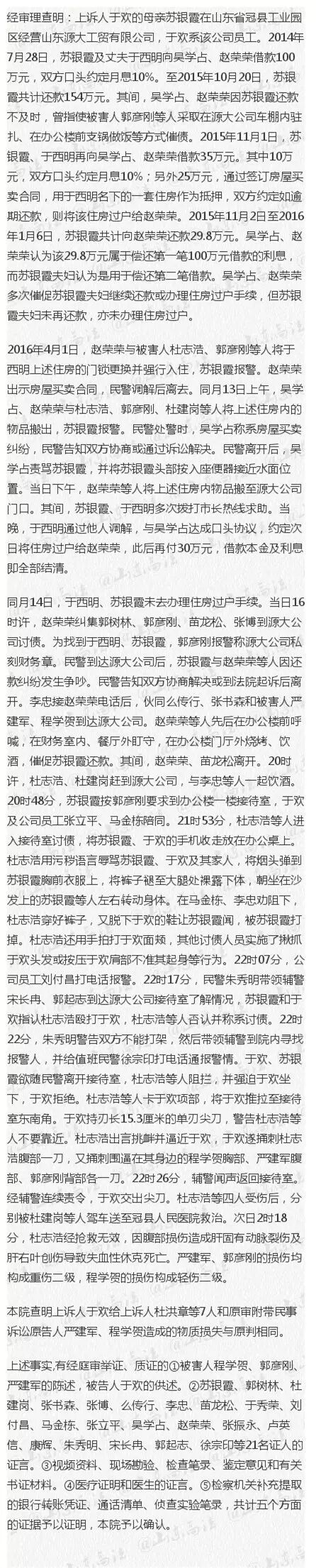 2017年2月17日,山东省聊城市中级法院一审以故意伤害罪判处于欢无期徒刑。2017年3月24日,山东省高级人民法院受理此案当事人上诉案。 2017年5月27日,山东省高级人民法院二审公开开庭审理。2017年6月23日山东高院撤销一审判决,判决于欢犯故意伤害罪,判处有期徒刑五年。