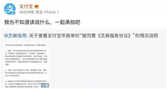 昨晚,许多兴冲冲晒过支付宝账单的网友们发现,已在不知不觉间中了套路,签订了一个“服务协议”。“我同意《芝麻服务协议》。”不但字特别小,而且已经帮你勾选了“同意”。