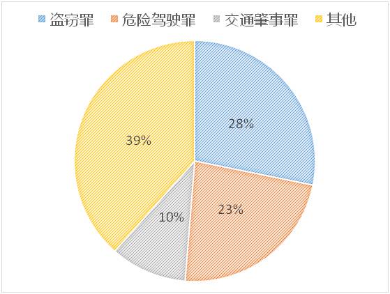 从比例上看,盗窃罪、危险驾驶罪、交通肇事罪之和占到刑事案件数量的61%。