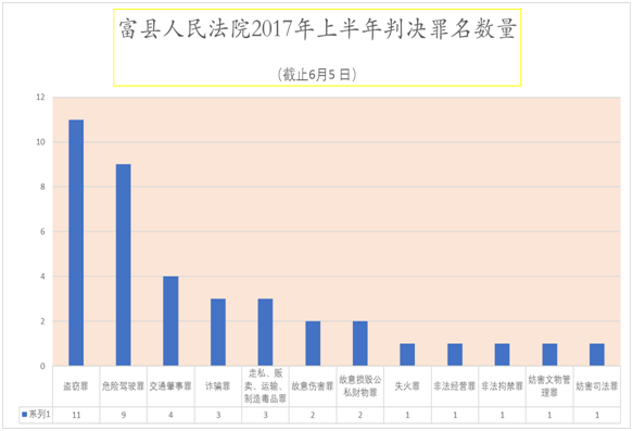 2017年1月1日至6月5日,富县人民法院公布的刑事判决书39份,涉及12个罪名,其中盗窃罪案件以11件位居榜首,危险驾驶罪案件以9件位居第二,第三名是交通肇事罪案件。