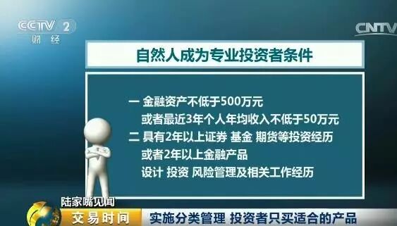 从7月1日开始,A股自然人投资者将被分为“专业投资者和普通投资者”两类。成为专业投资者要满足两个条件: