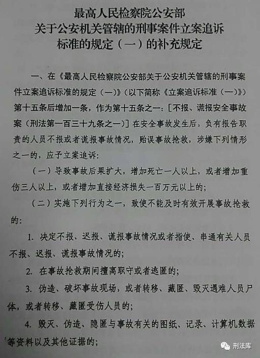 一、在《最高人民检察院公安部关于公安机关管辖的刑事案件立案追诉标准的规定(一)》(以下简称《立案追诉标准(一)》)第15条后增加一条,作为第15条之一:[不报、谎报安全事故案(刑法第139条之一)]在安全事故发生后,负有报告职责的人员不报或者谎报事故情况,贻误事故抢救,涉嫌下列情形之一的,应予立案追诉: