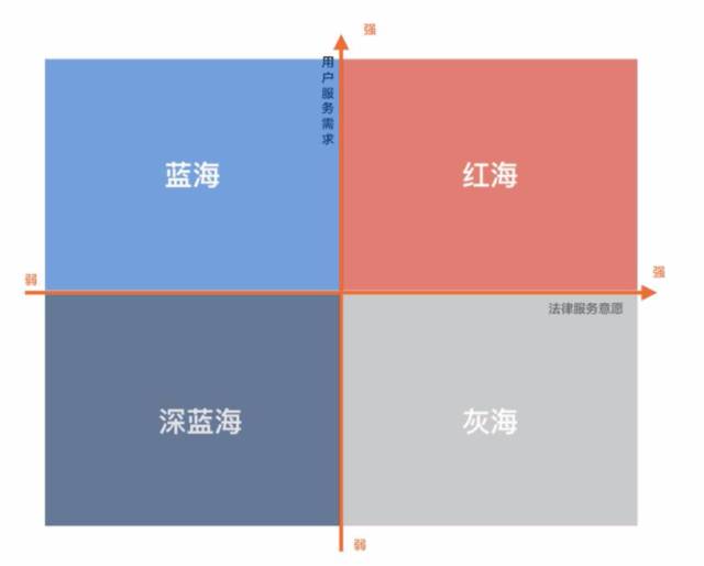 第二三象限,用户服务需求有的强,有的弱,律师的服务意愿也相对不高,但我认为,这恰恰是律师、律所的机会。因为这些属于法律服务的“蓝海”、“深蓝海”,这部分业务潜力大,体量大,蕴藏着无穷的商机。