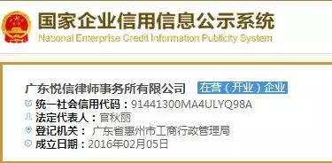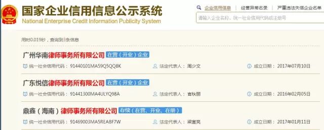 经检索发现,“律师事务所有限公司”已不是第一次被注册。去年以来已有两个此类公司在惠州、海南注册成立。